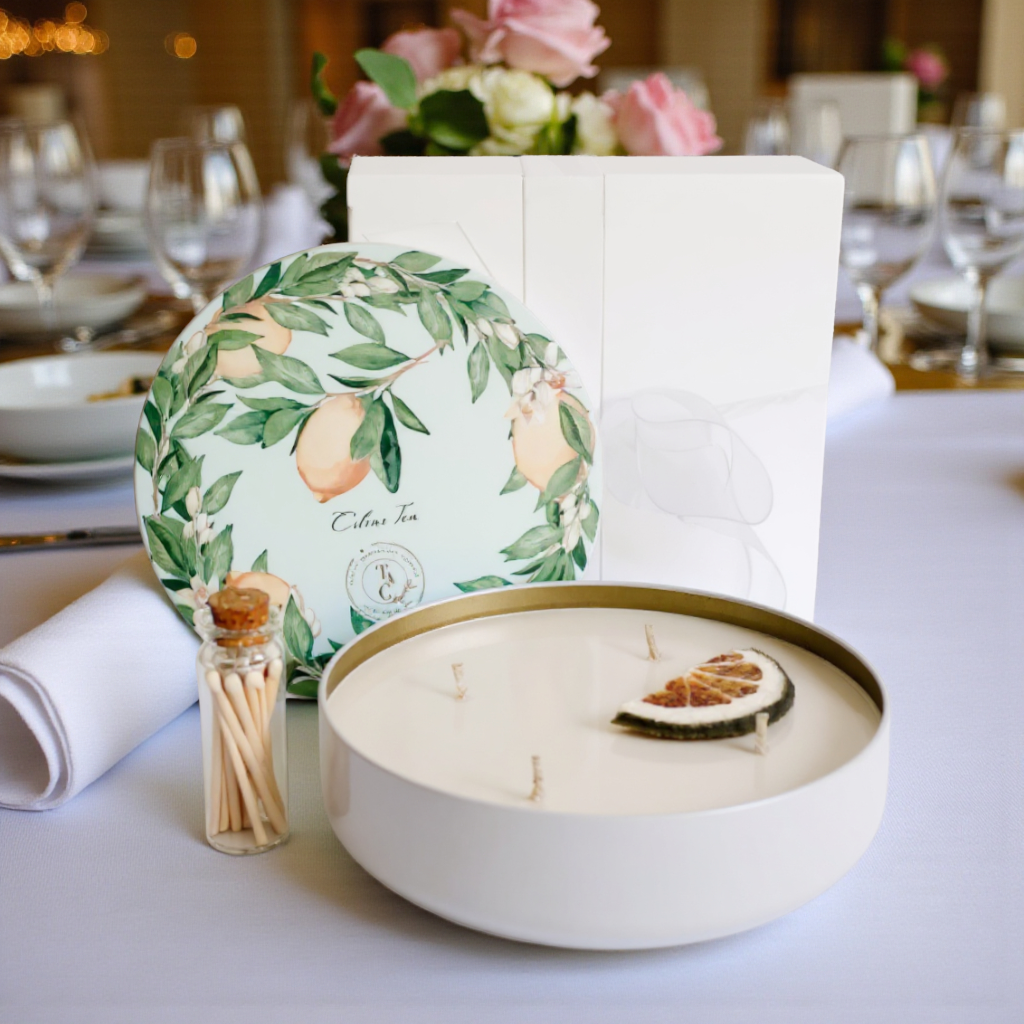 Introducing the Citrus Tea Glittering 4-Wick Candle in a classic White Tin Vessel. This candle features a mesmerizing pearl mica wax that shimmers and dances when lit, creating a stunning effect. The fresh citrus aroma boasts top notes of Calabrian bergamot, mandarin, and pink grapefruit, followed by middle notes of cardamom, white tea, and star jasmine, and settles on base notes of transparent amber, tonka bean, and musk.