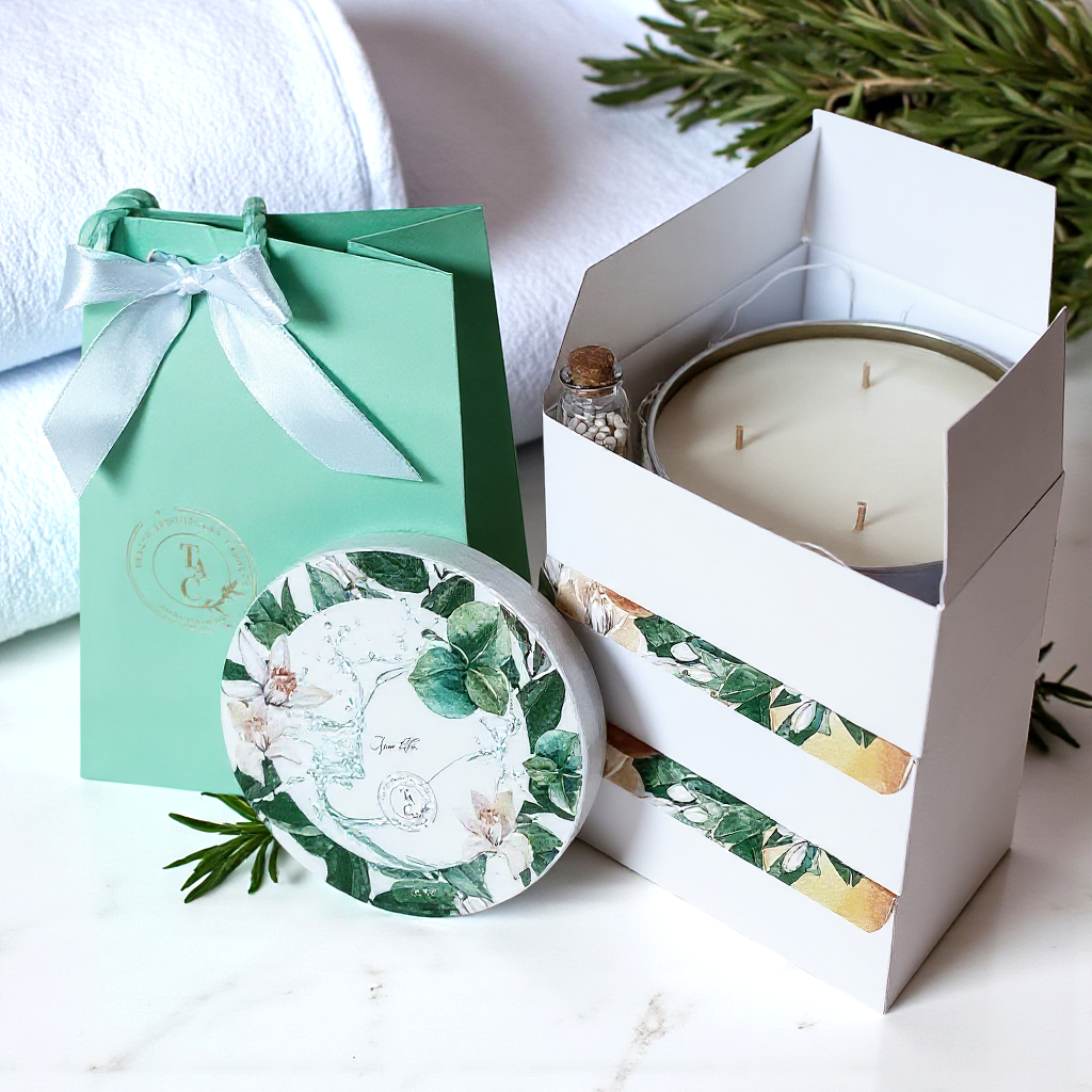 Presenting the Spa Life 4-Wick Candle in a timeless White Tin Vessel, featuring a fragrance blend of zesty Lemon, Lime, and Lemongrass top notes, complemented by Jasmine, Black Currant, and Sugar middle notes, and a grounding base of Patchouli and Powder.