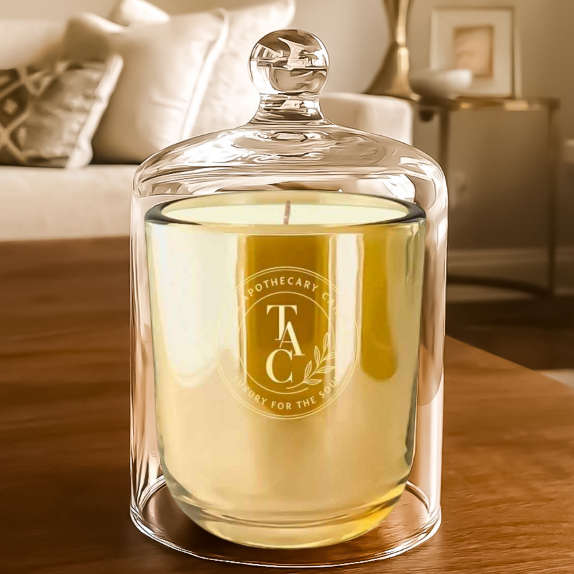This exquisite candle is meticulously handcrafted from lustrous, weighty champagne-colored glass and topped with a crystal-clear, hand-blown glass cloche, radiating timeless sophistication.